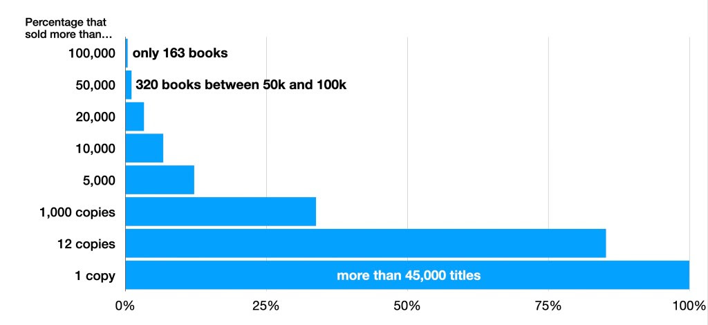 Of those people commenting on these statistics, Seth Godin included the following graph to detail something pretty important. Namely, a lot of books do not sell very well. See below.